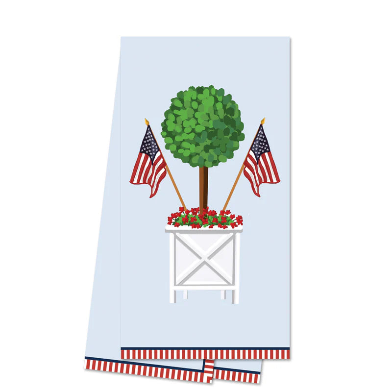 This towel features our darling patriotic topiary tree on the front, with a light blue background, and a red stripe border.