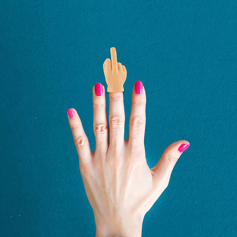Bring all the laughs with this tiny hand. Fits directly on your finger to show everyone how you really feel!