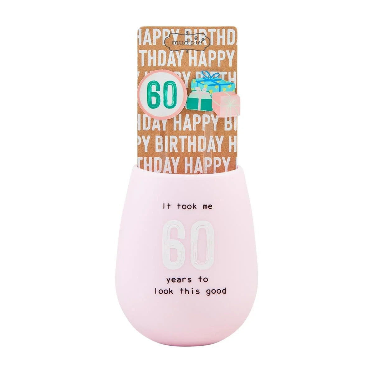 The 60 Birthday Silicone Wine Set is an ideal 3-piece set designed for birthday celebrations. It features a stemless silicone wine glass that is both sturdy and comfortable to grip. Moreover, the set includes two acrylic birthday straws, which bring a playful and festive element to your beverages. Crafted with top-notch silicone, this set is perfect for outdoor gatherings or picnics. Elevate your wine-drinking experience with this adaptable and functional wine set.