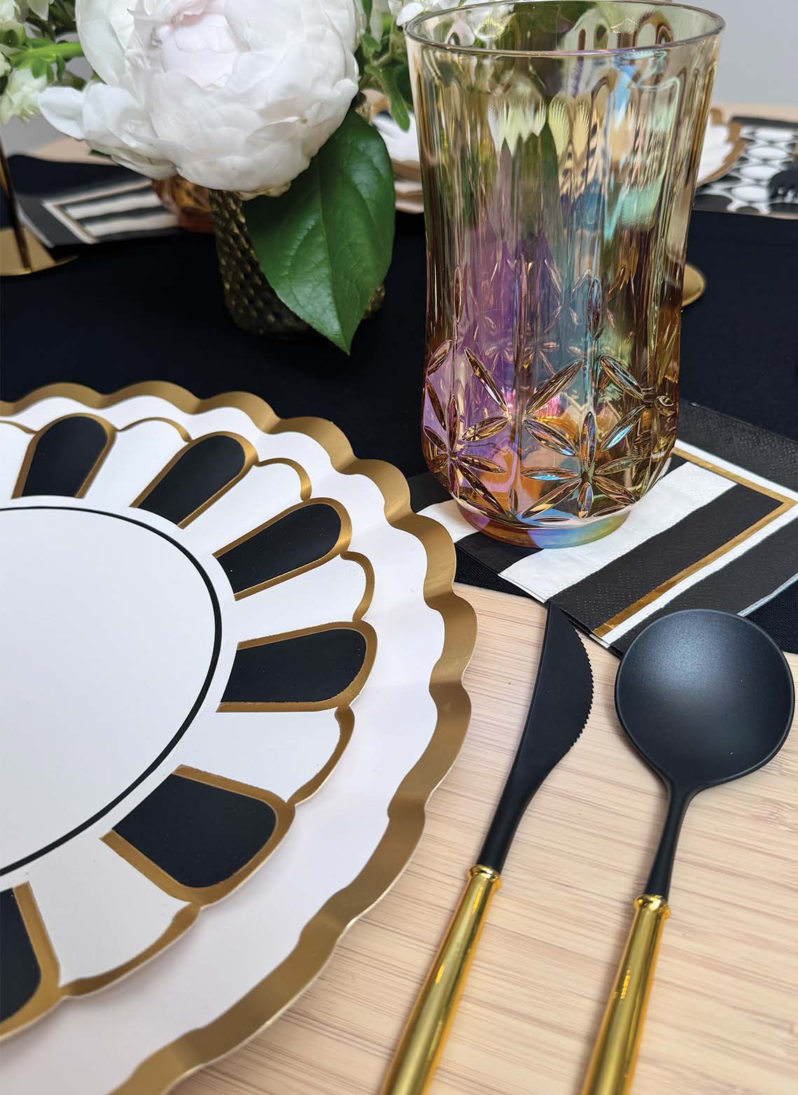 These scalloped-edge black and white dinner plates feature a stunning metallic gold trim and are the perfect touch of sophistication for any occasion. These plates are both durable and disposable, allowing you to skip the dirty dishes, without sacrificing quality and style. Your guests will never believe they’re disposable!