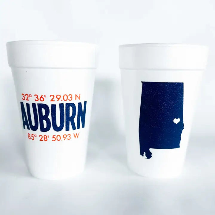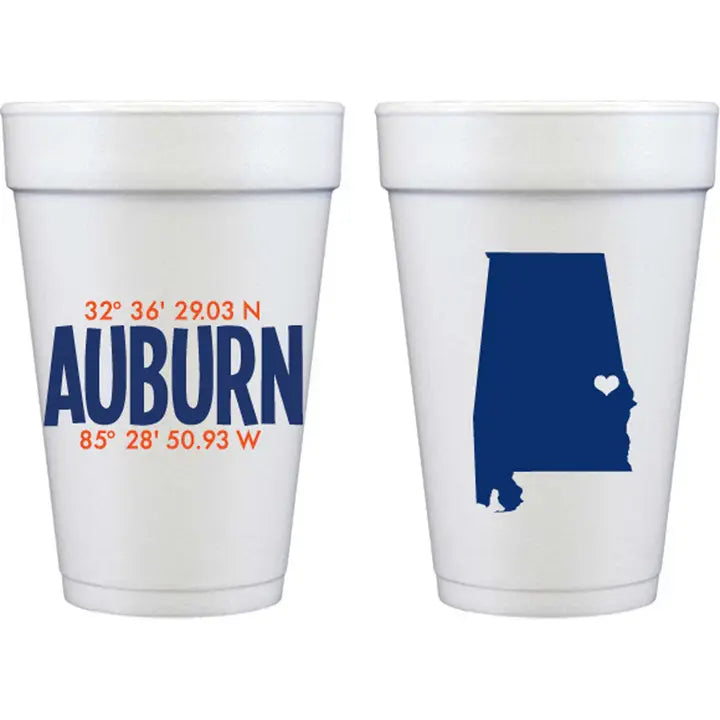 Our Auburn, Alabama GPS coordinate foam cups show the greatest college town with AUBURN written in a fun block font and navy ink and the GPS coordinates displayed in a sleek. modern font using orange ink. Each bag of 10 cups is tied with a twist tie ribbon.