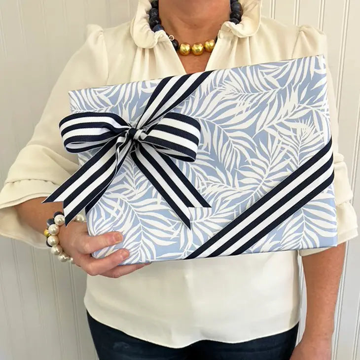 We're VERY excited to announce our brand new gift wrap sheets! This beautiful light blue and white palm pattern is our new must-have!