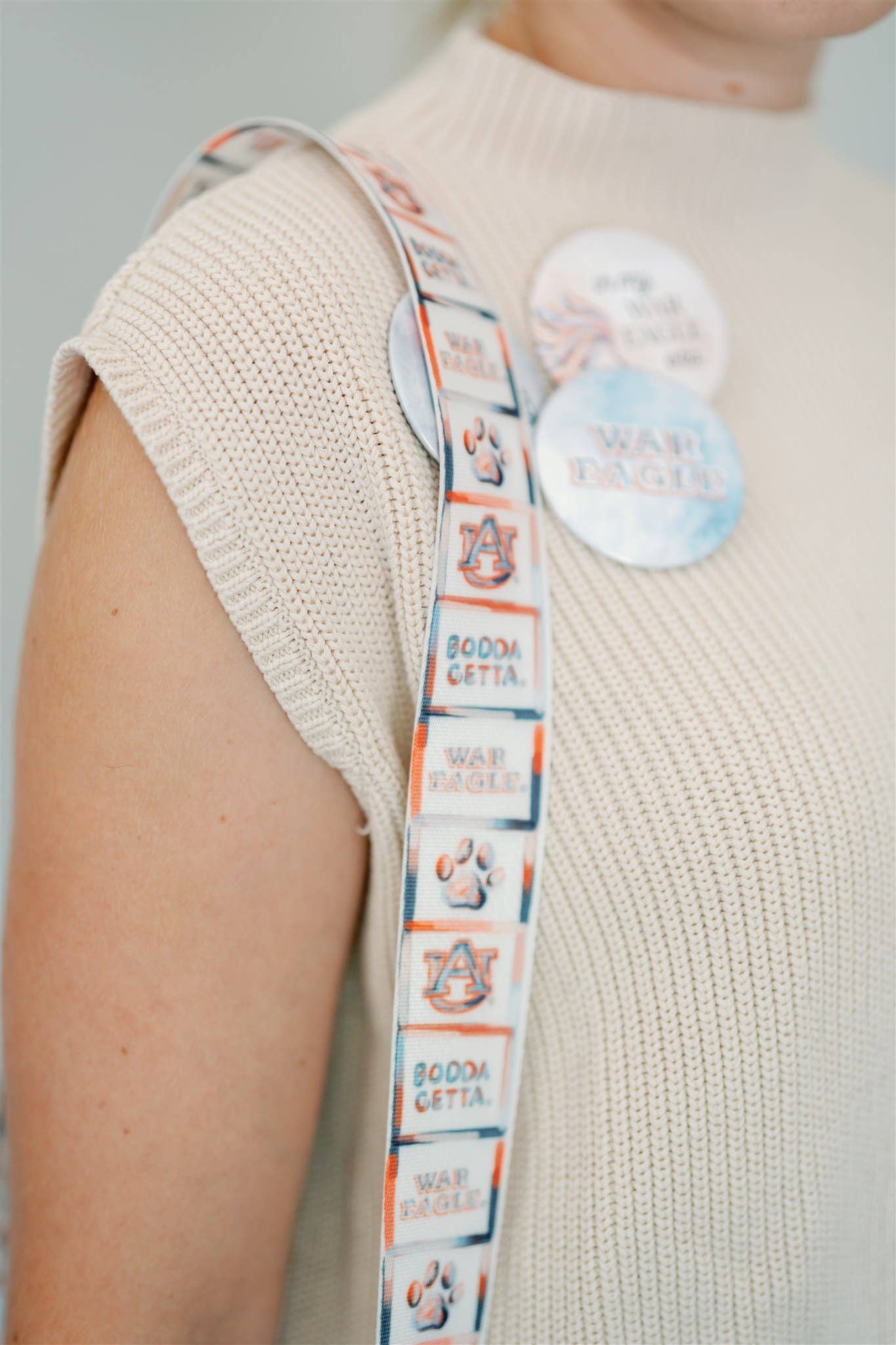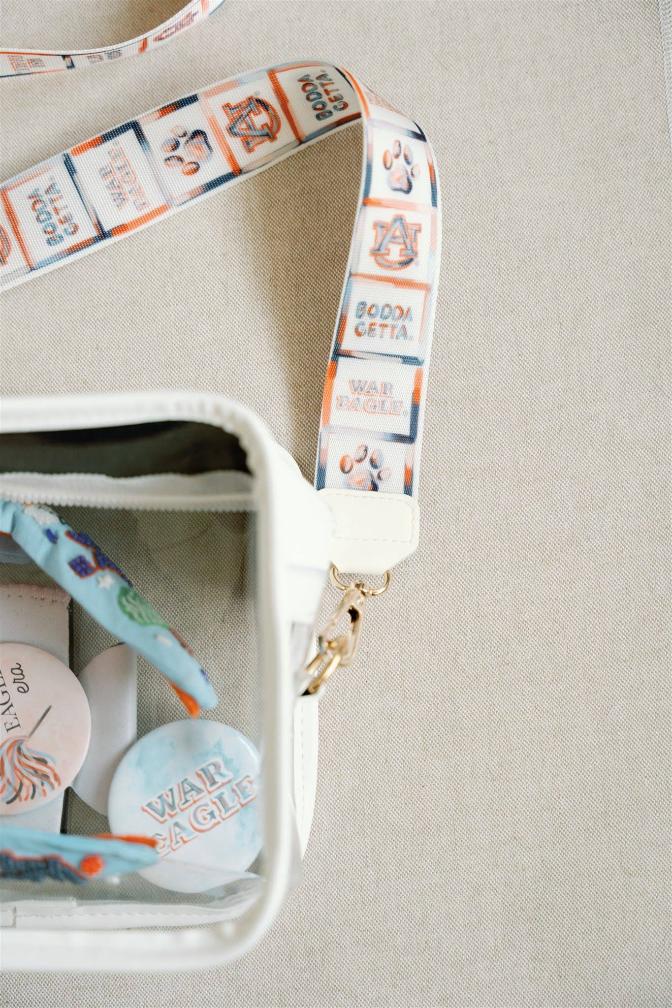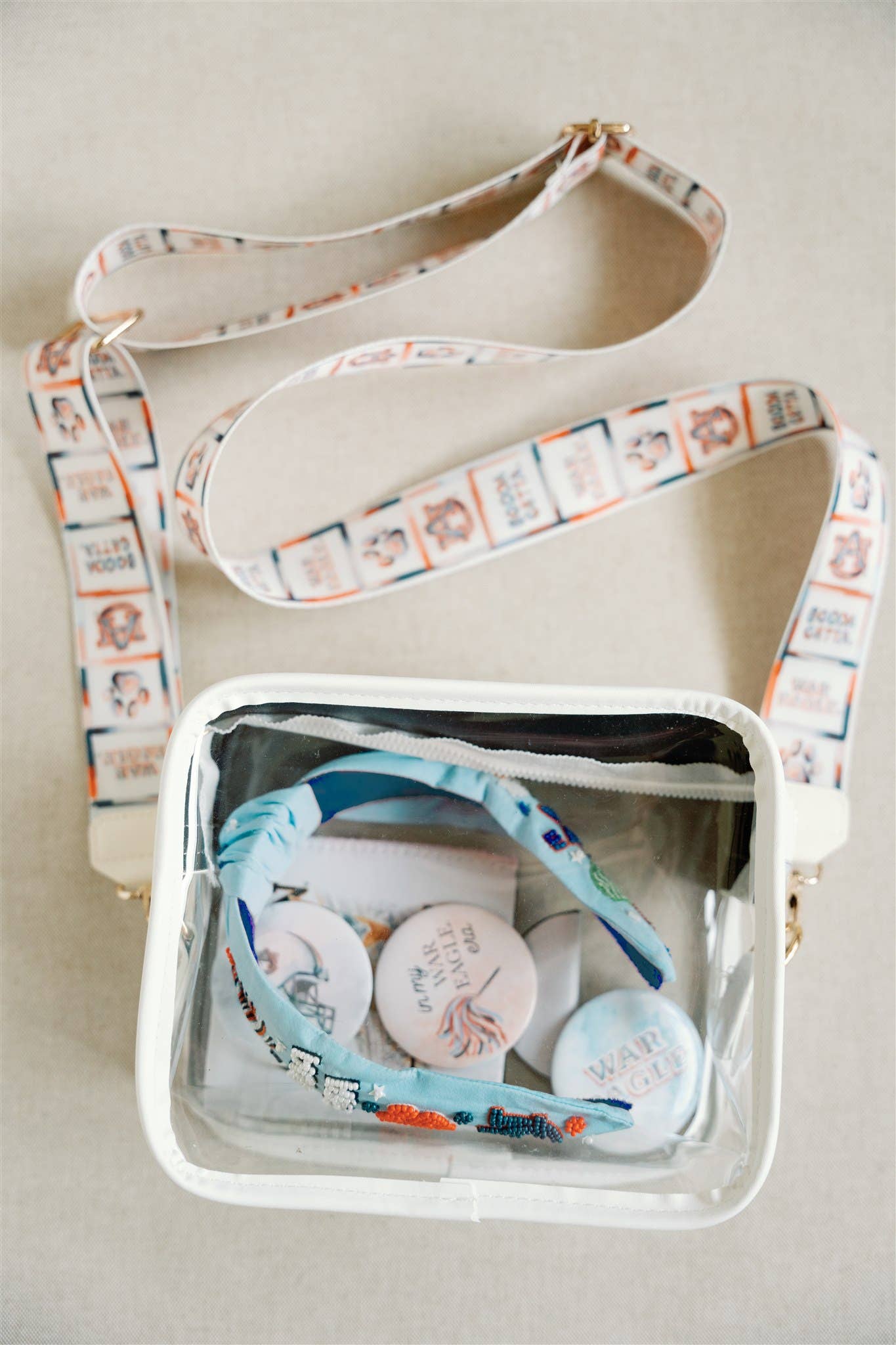 The bag features a printed adjustable strap with Auburn icons, such as Aubie the Tiger, the AU logo, a paw print, War Eagle, and more!