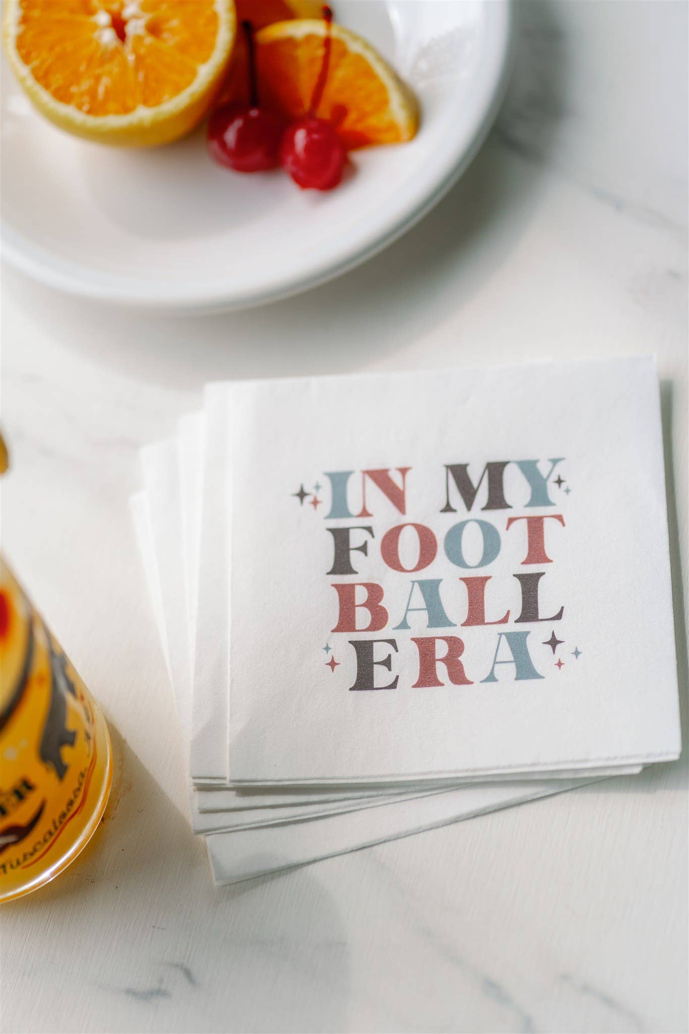 5x5 inch white napkins with orange and blue digital printing printing in a retro font.