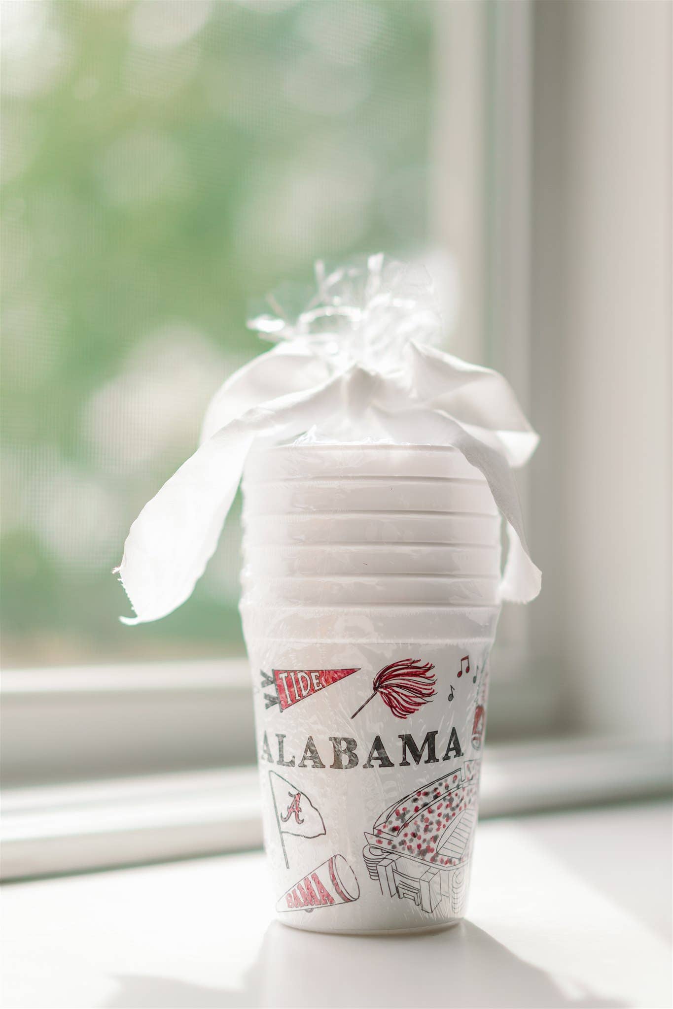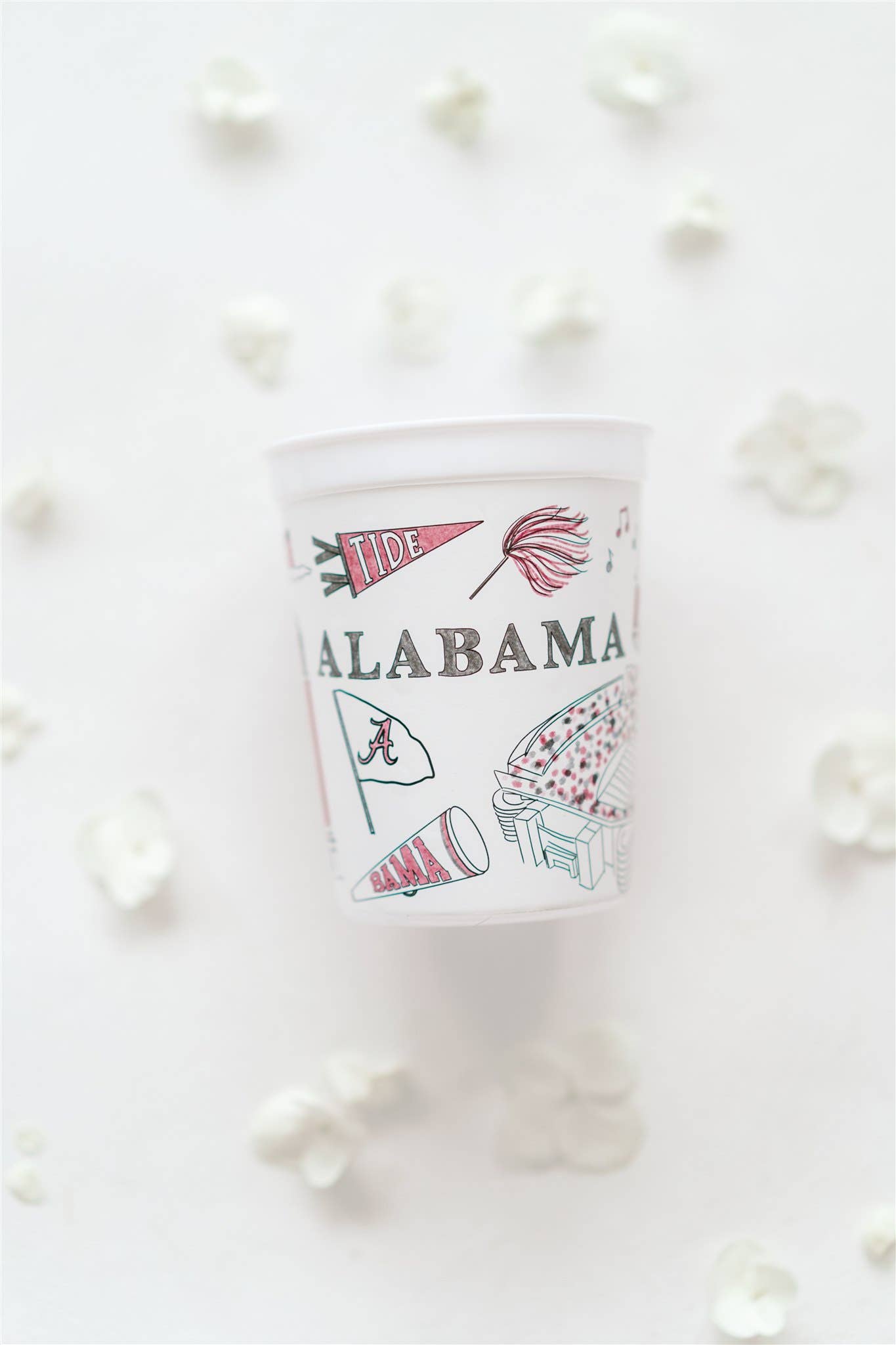 16 ounce white stadium cup with orange and blue illustrations featuring Alabama's iconic spots, such as Bryant-Denny Stadium, Million Dollar Band hat, cheerleading megaphone and more!