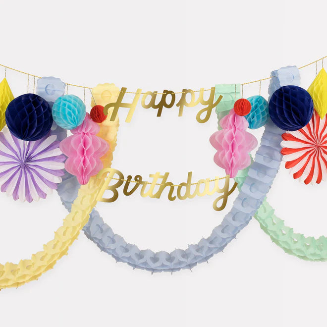 - 2 Garlands - one with the word Happy and the honeycomb pennants, and one with the word Birthday, both with gold cord and gold foil letters