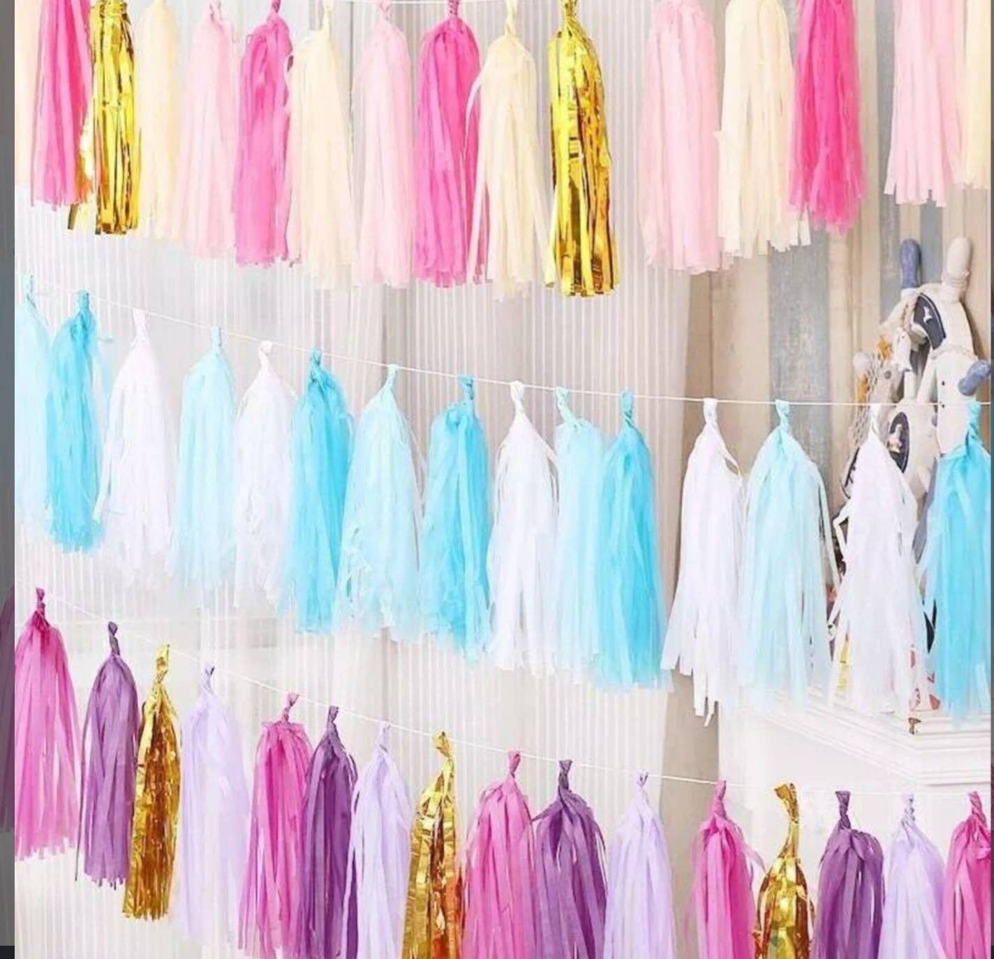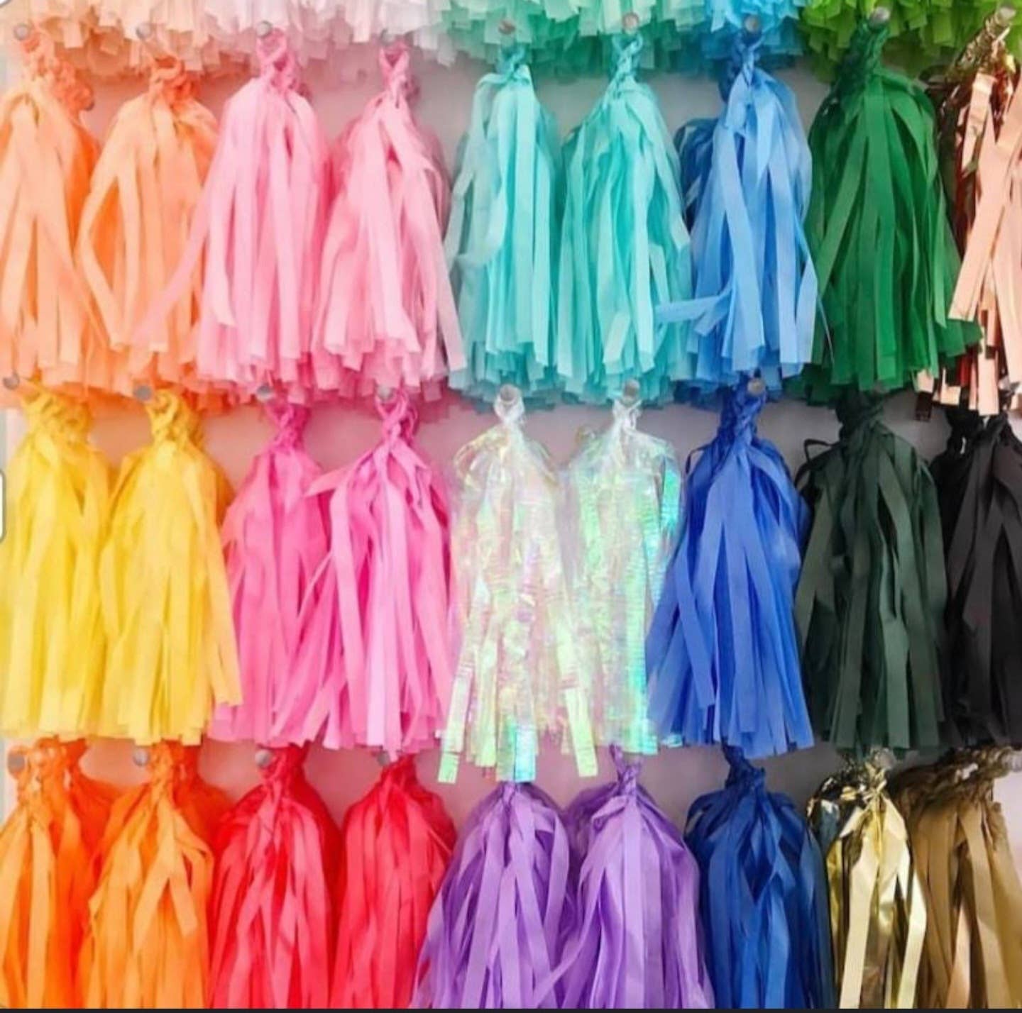 Hand made tissue paper tassels are a great way to add something unique and customizable for your party throwing clientele. Each tassel is hand made to order, pick and chose your custom colors with no minimum purchase. These tassels are a great opportunity to set your shop apart with a way to accessorize balloons and create a customer experience by letting them create their own tassel garland, unique to there party color needs.