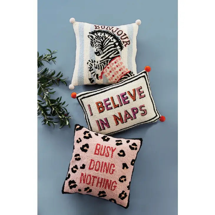 I Believe in Naps Hook Pillow with Pom Poms
