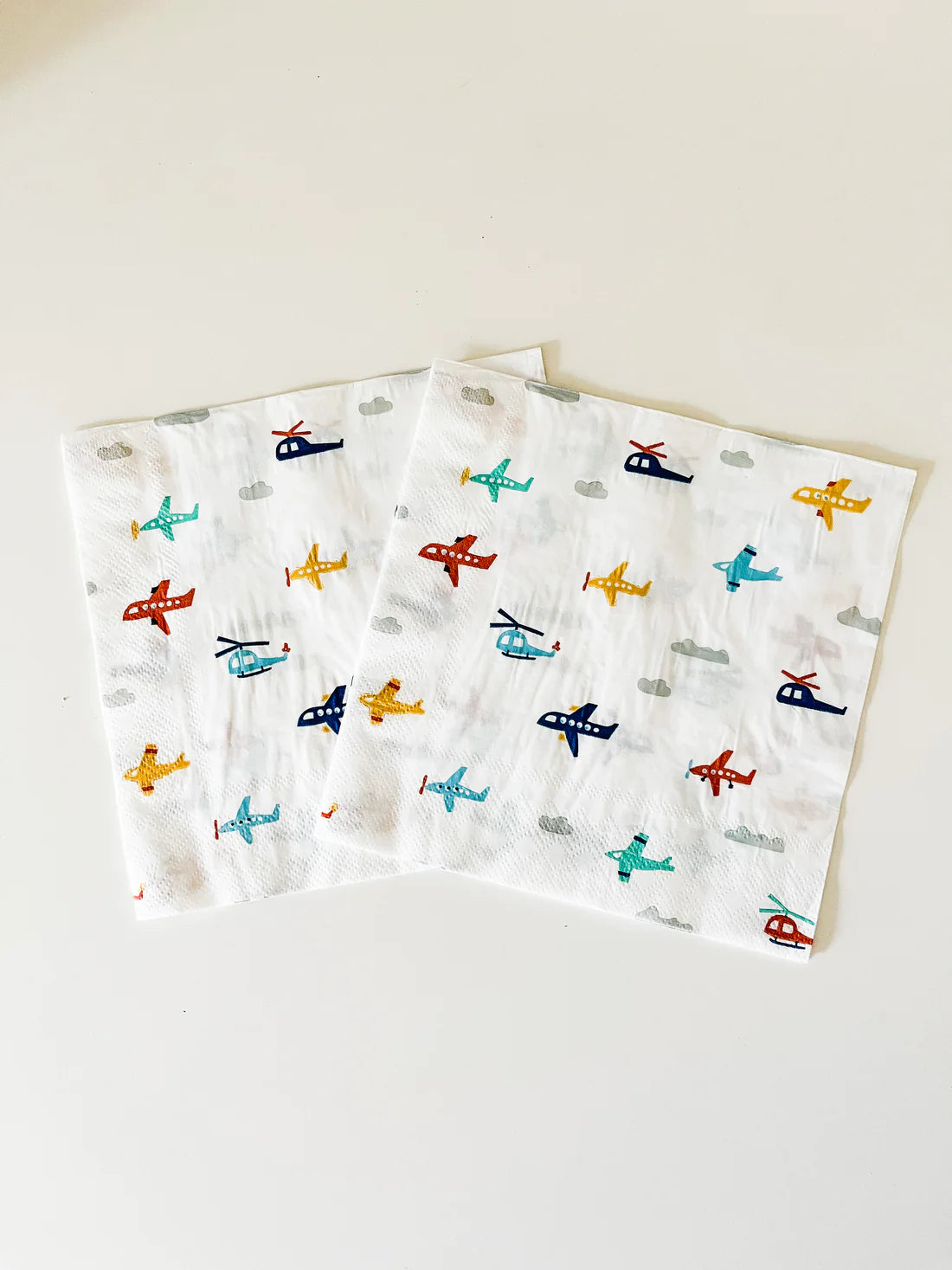 These Large Napkins are perfect for parties with an aviation theme. Each pack contains 16 napkins, measuring 13x13 inches, with a bright, creamy-colored base and a colorful pattern of airplanes in various styles. Enjoy a touch of vibrancy with shades of green, blue, and yellow. Get ready for airborne fun with these airplane party napkins!