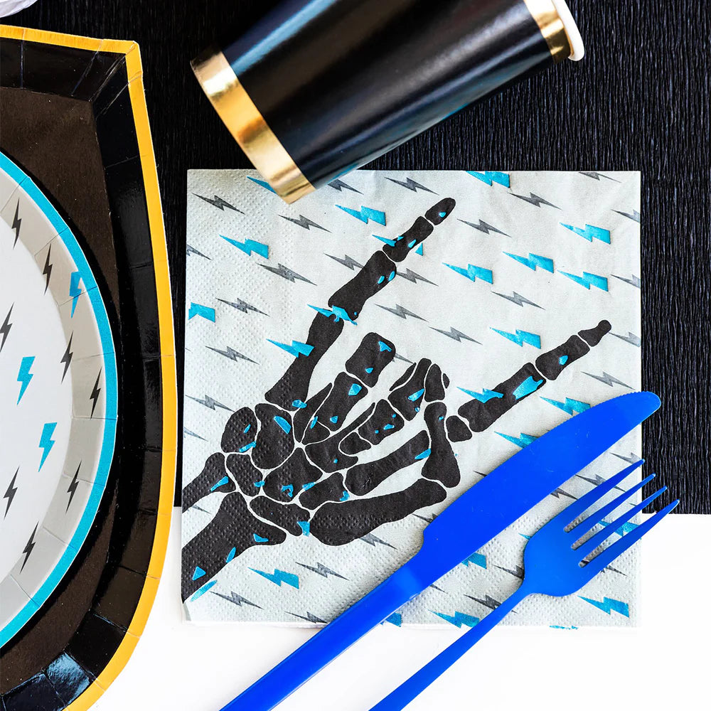 From the Jollity & Co Spooktacular Halloween Collection, this skeleton hand rocking out is so cool, you won't want to use it as a napkin. It's embellished with blue foil and lightning bolts! Check out the matching dinner plate.
