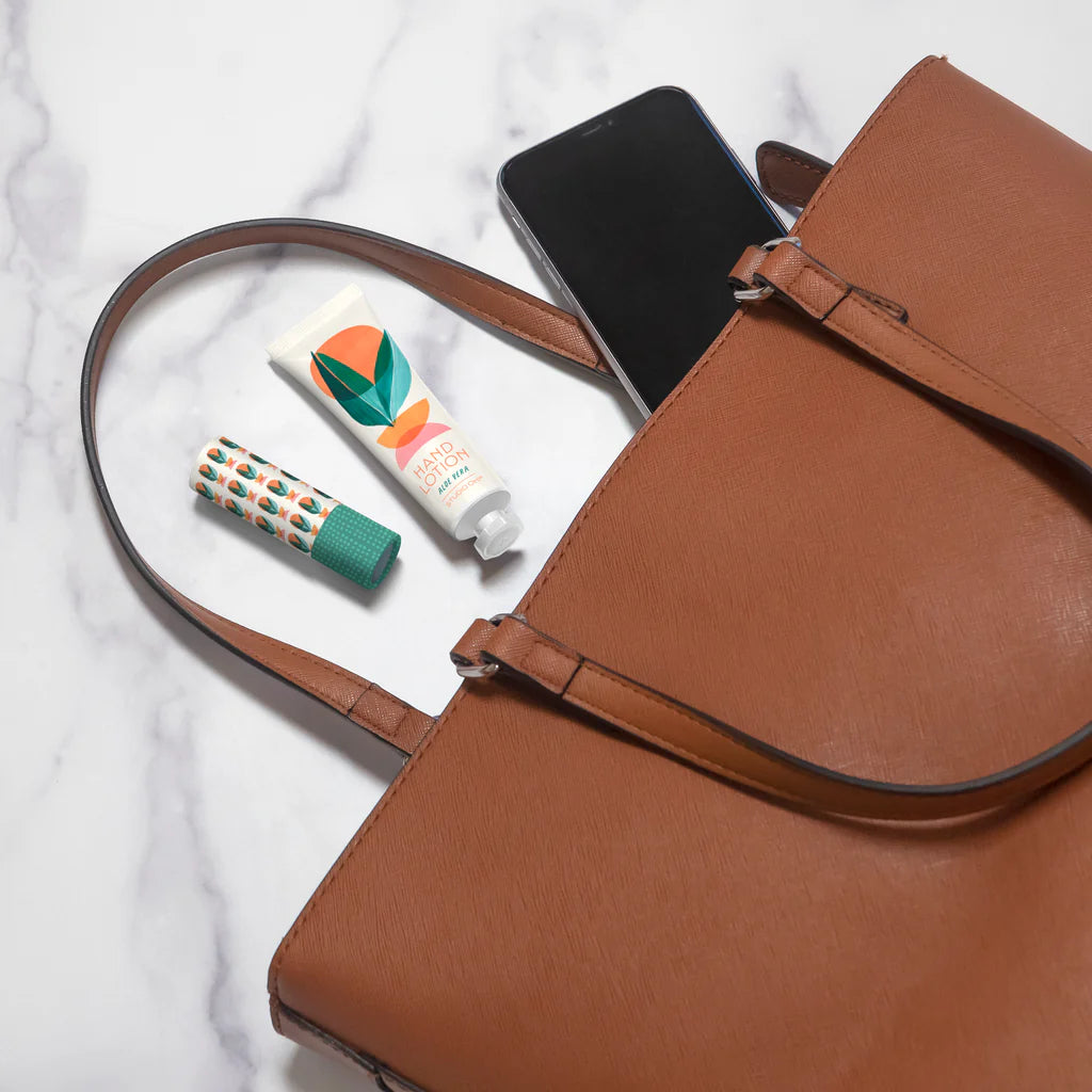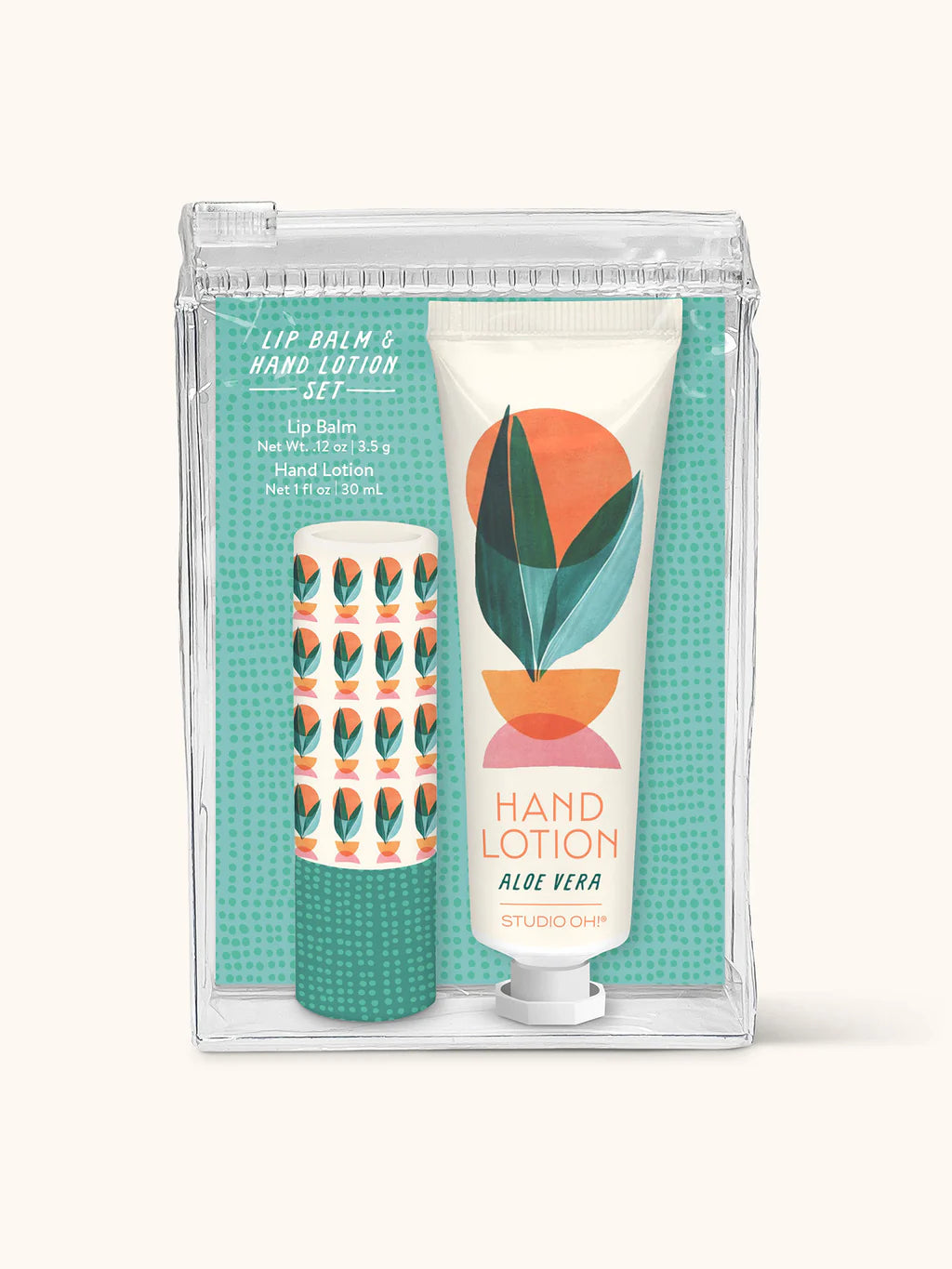 The Lip Balm & Hand Lotion Set from Studio Oh! includes a hand lotion and lip balm packaged in a clear, reusable pouch. The unscented lip balm helps gently moisturize and smooth dry lips, while the scented hand lotion hydrates hands and cuticles. The two-piece set is artfully designed and perfect for carrying in a handbag or gifting to a friend.