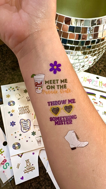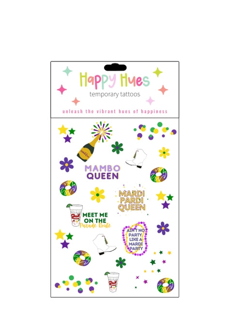 Happy Hues Temporary Tattoos are designed with you in mind to let the good times roll! Introducing our vibrant and captivating Mardi Gras-themed non-toxic temporary tattoos! Perfect for adding a touch of festive flair to any occasion, these tattoos are designed to make a lasting impression.