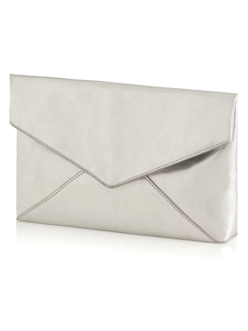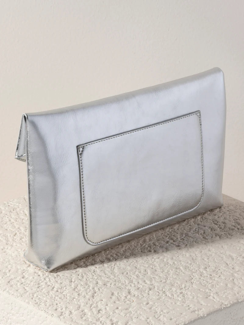 Shine bright and make a bold statement with Shiraleah’s Maddie Envelope Clutch. This chic and stylish oversized clutch is made from trendy metallic PU and adds a pop of glamorous silver shimmer to any outfit. Shaped like an envelope with an elegant, triangular folding closure, this large handbag is perfect for fitting your phone, wallet, and other day or nighttime essentials. Pair with the matching Maddie Card Case, or other items from Shiraleah to complete your look!