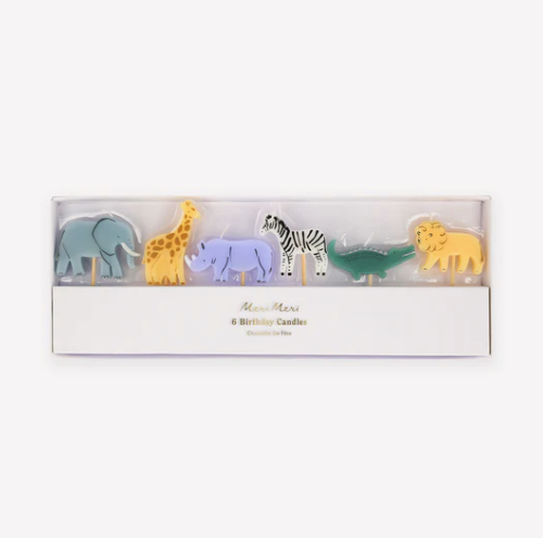 - 6 animal candles - elephant, giraffe, rhino, zebra, crocodile and lion in bright colors