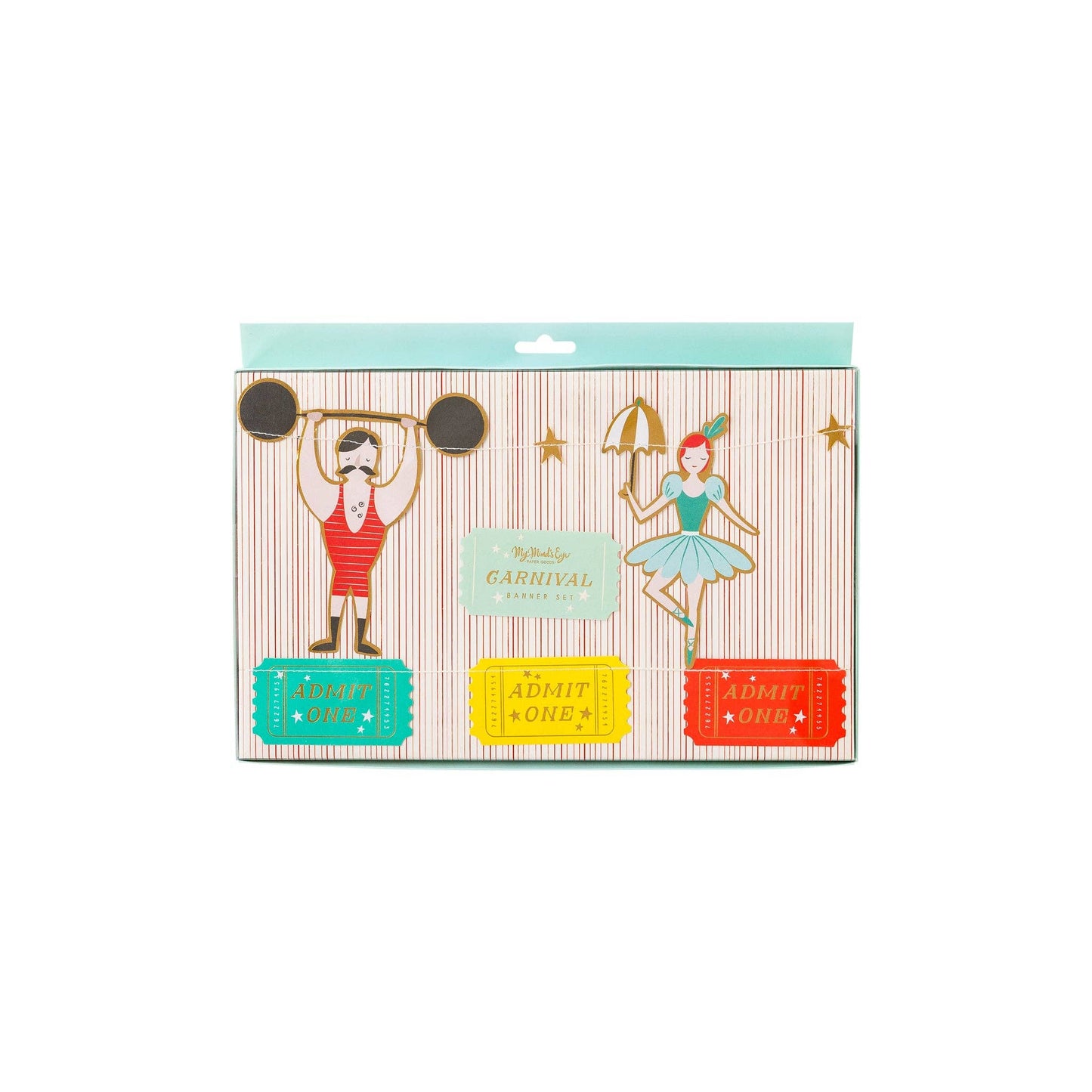 Step right up to the party with this whimsical carnival inspired banner set. Featuring a banner full of a cast of carnival characters that are a stand out with their gold foil accents. Also included in this banner set is a ticket banner that insures that you are admitted to all the fun!
