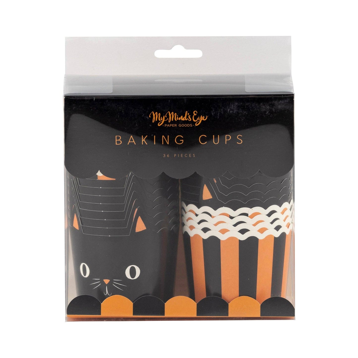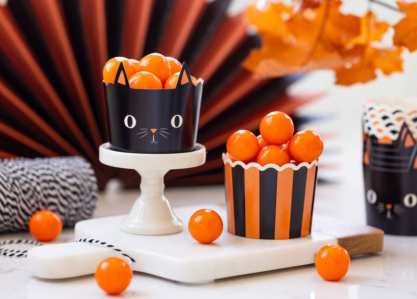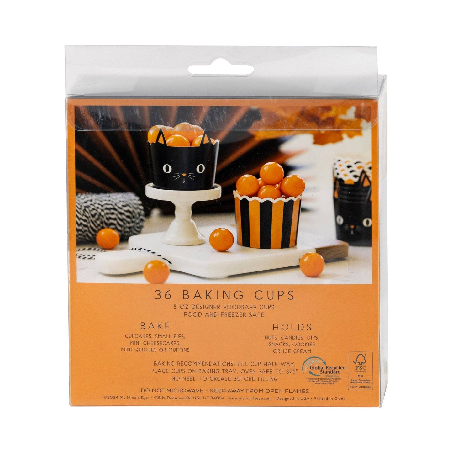 Add some "meow" to your Halloween party with our Cat Stripes baking cups! These 5 oz cups feature playful black cats and are sure to be a "purrfect" addition to your festive treats. Comes in a pack of 36. You get 36 baking cups in each box set. 18 of 2 coordinating designs.