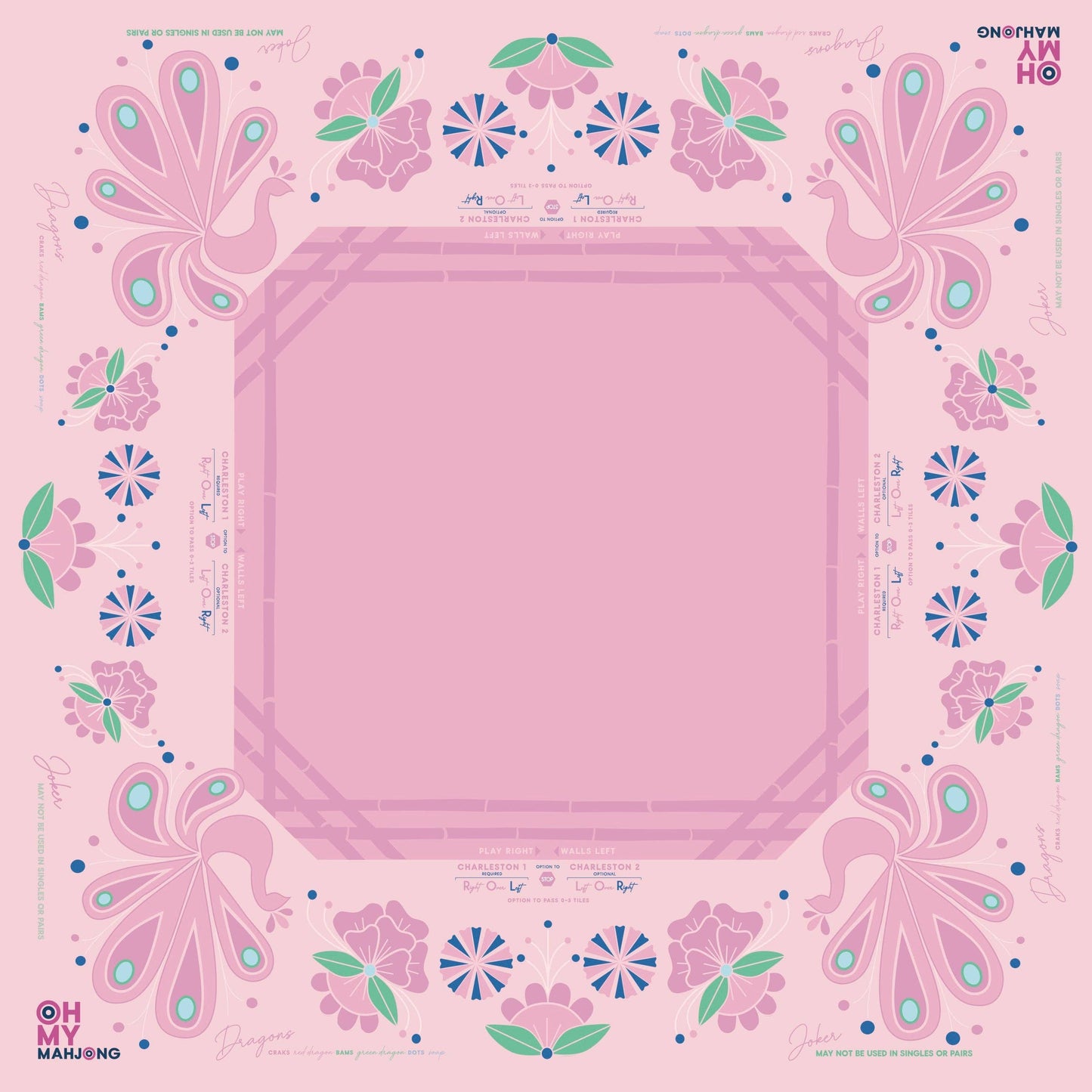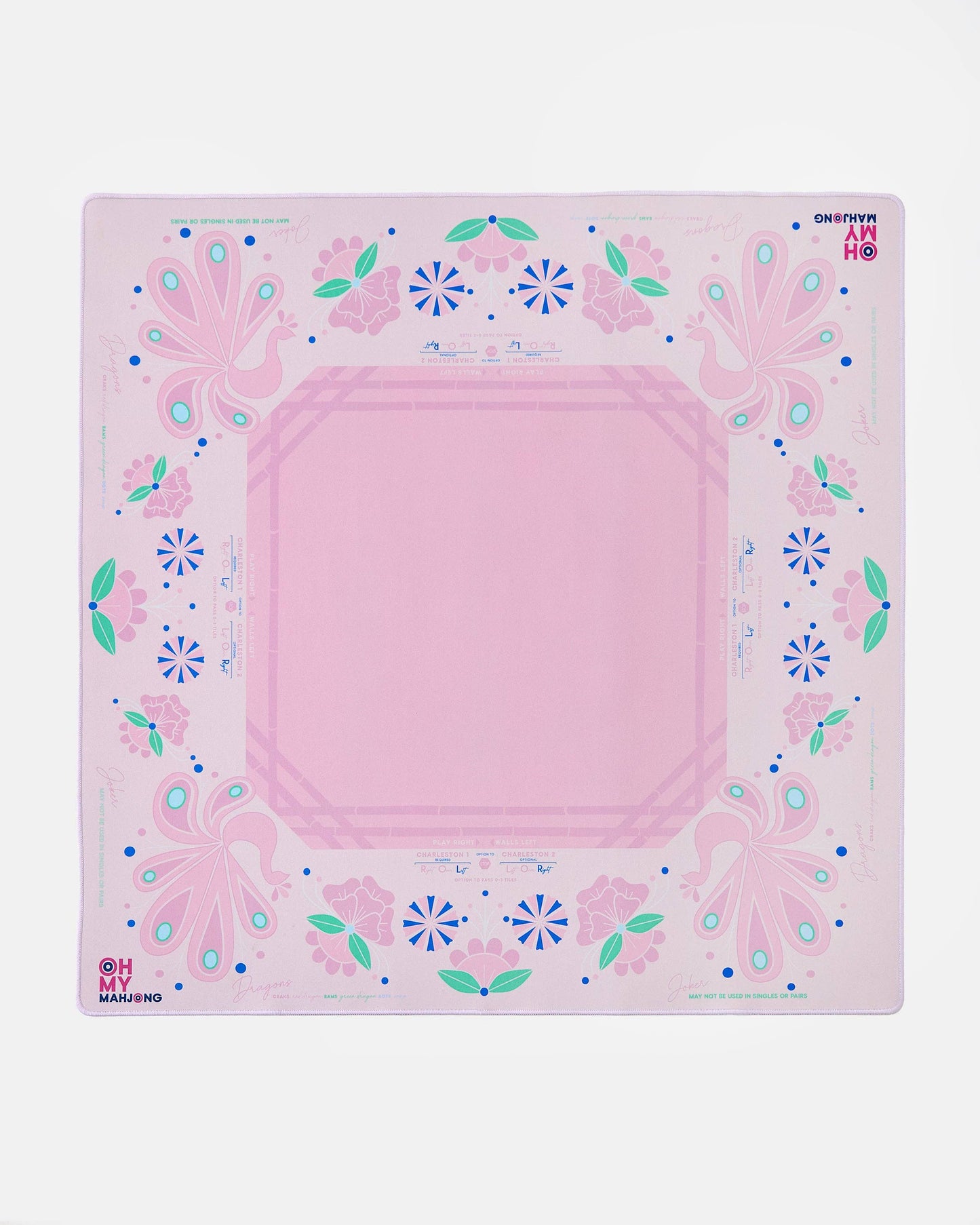 Introducing the Birdie Mahjong Mat! This vibrant mat features a stunning Birdie design and a non-slip surface to ensure your tiles stay put during even the most intense games. The Birdie Mahjong mat offers clear explanations directly on the mat, including the Charleston, suit and dragon pairings, wall direction, and the "no jokers in a pair" rule. Pairs perfectly with the Birdie Mahjong Tiles!