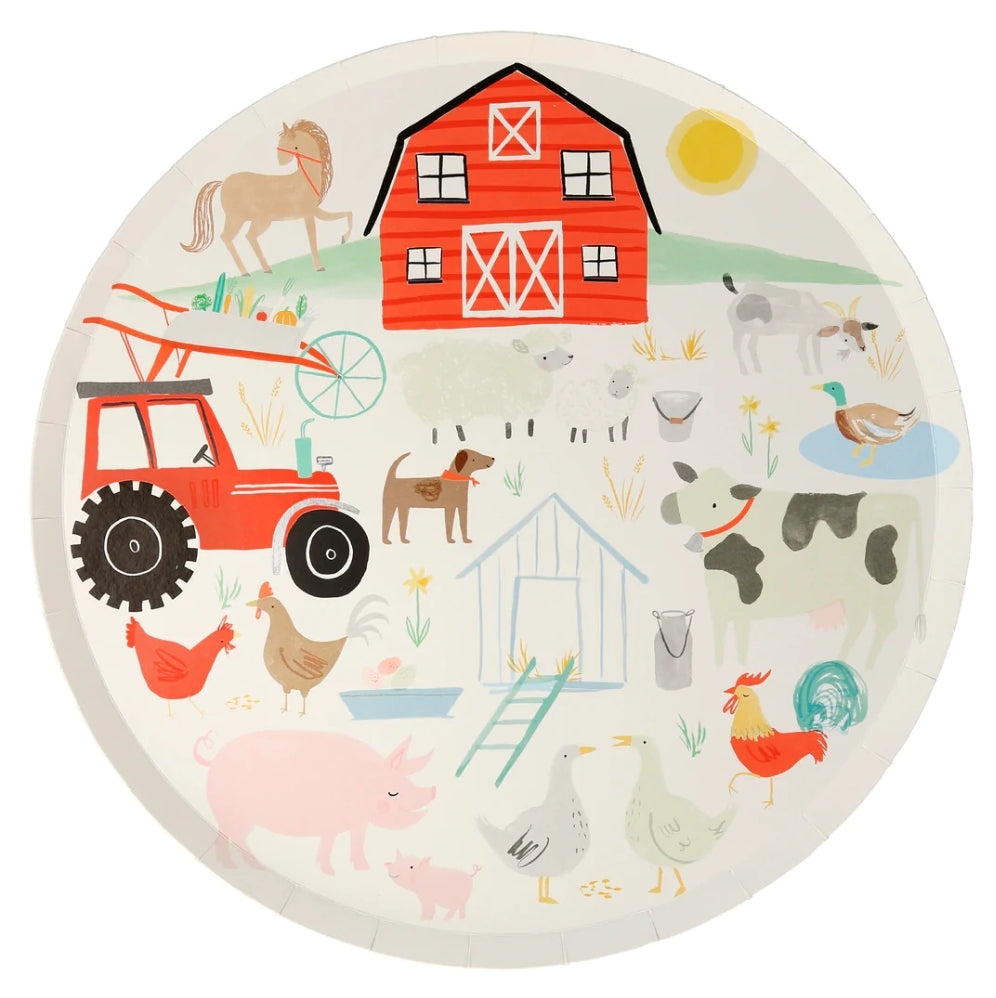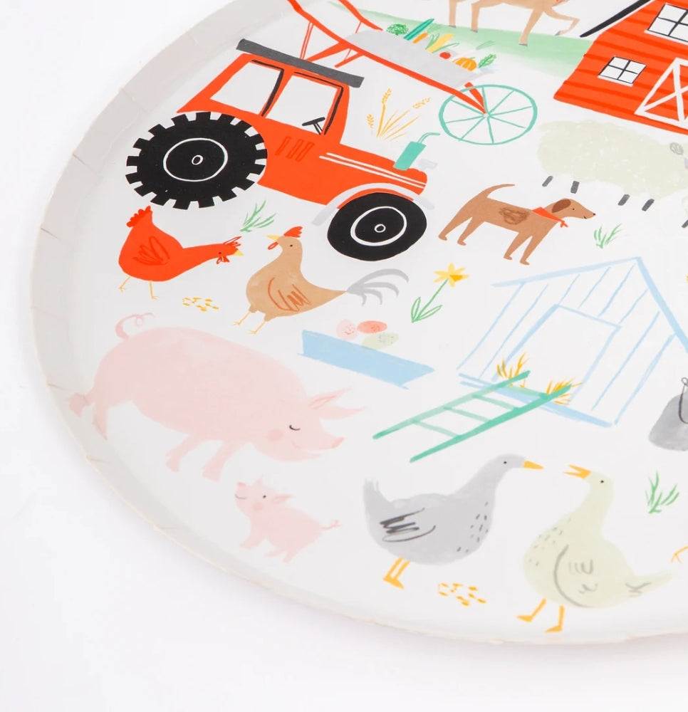 These colorful On the Farm dinner plates will look brilliant on the party table. Featuring beautiful illustrations of a busy farmyard scene, with the farmhouse, tractor and many farmyard animals, they'll be sure to delight your party guests.