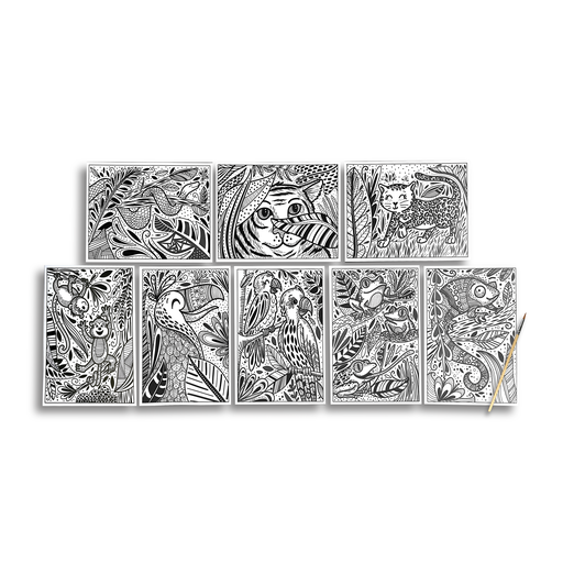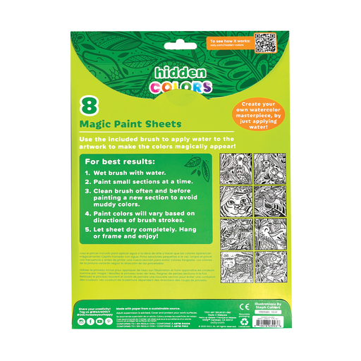 Close your eyes and picture the jungle. What do you see? Bring it all to life with these hidden colors magic painting sheets! Just add water to discover the bright and bold colors of the jungle! The kit includes eight different reveal sheets of the jungle, as well as a brush to apply the water.