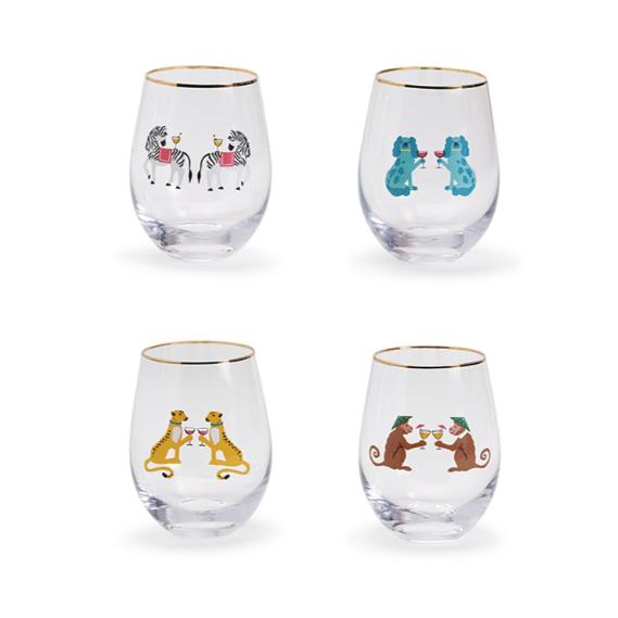 How fun and adorable are these animal cheers stemless wine glasses? These would go perfectly paired with our party animal cotton embroidered napkins. These glasses will bring a chic touch to your favorite barware assortment or party!