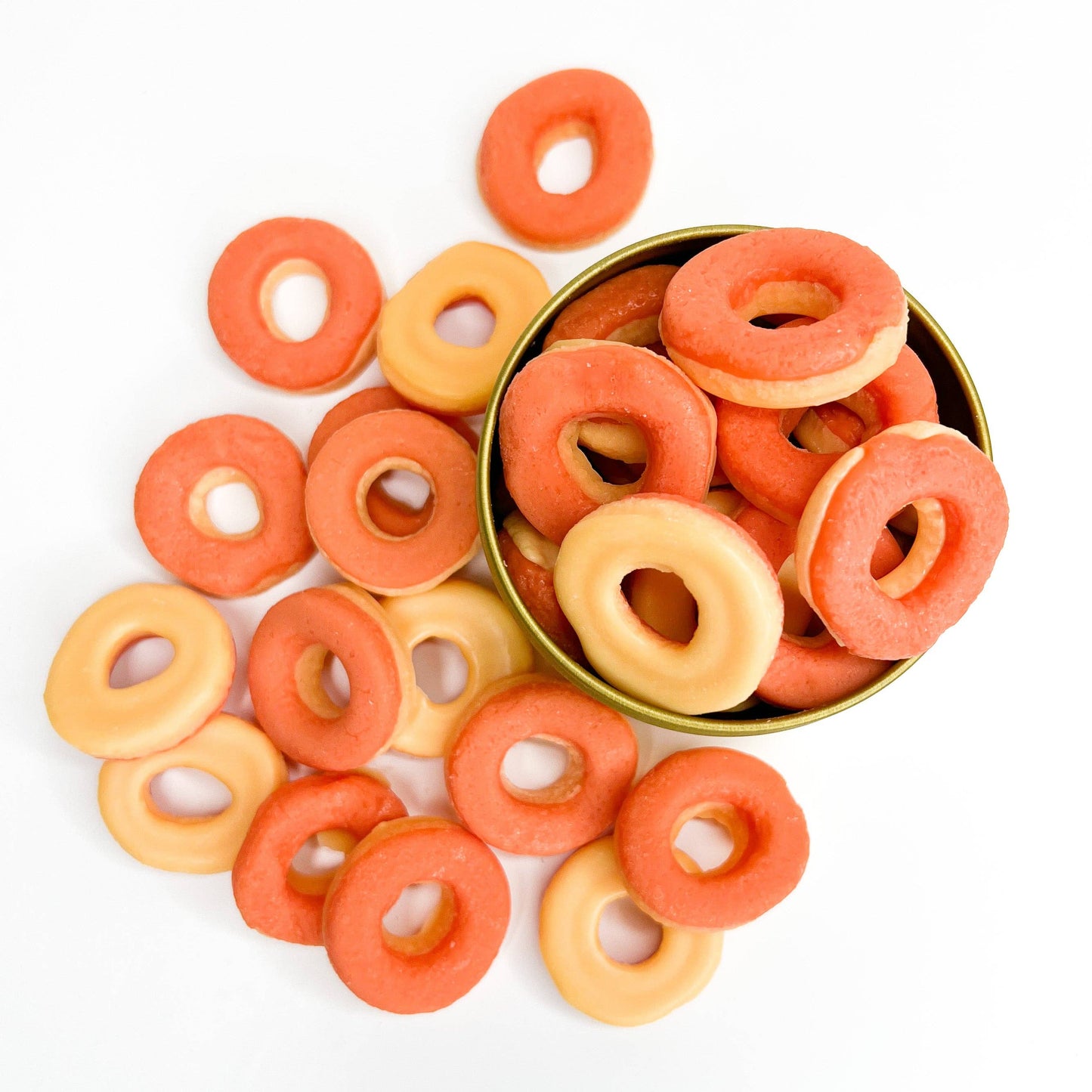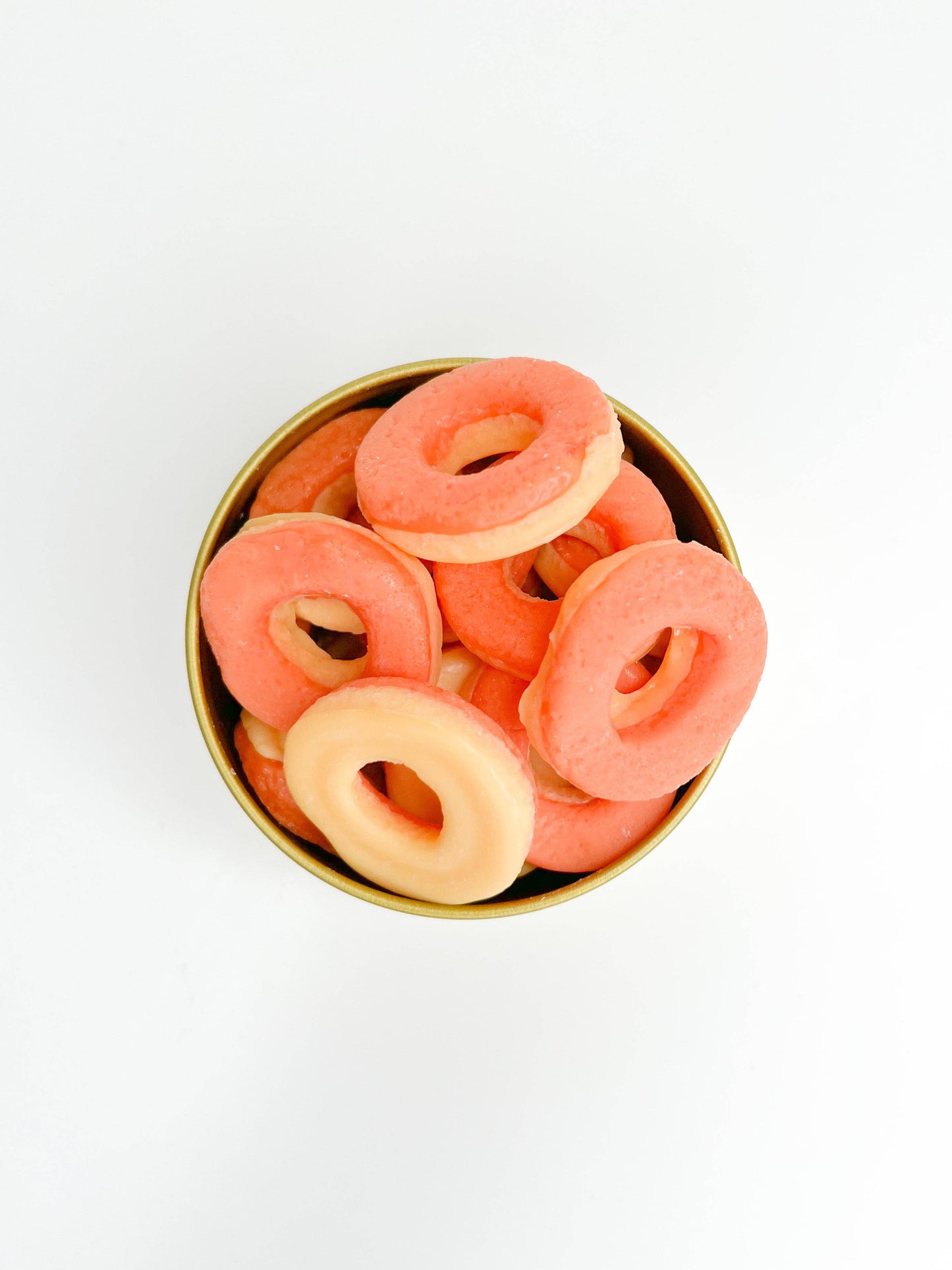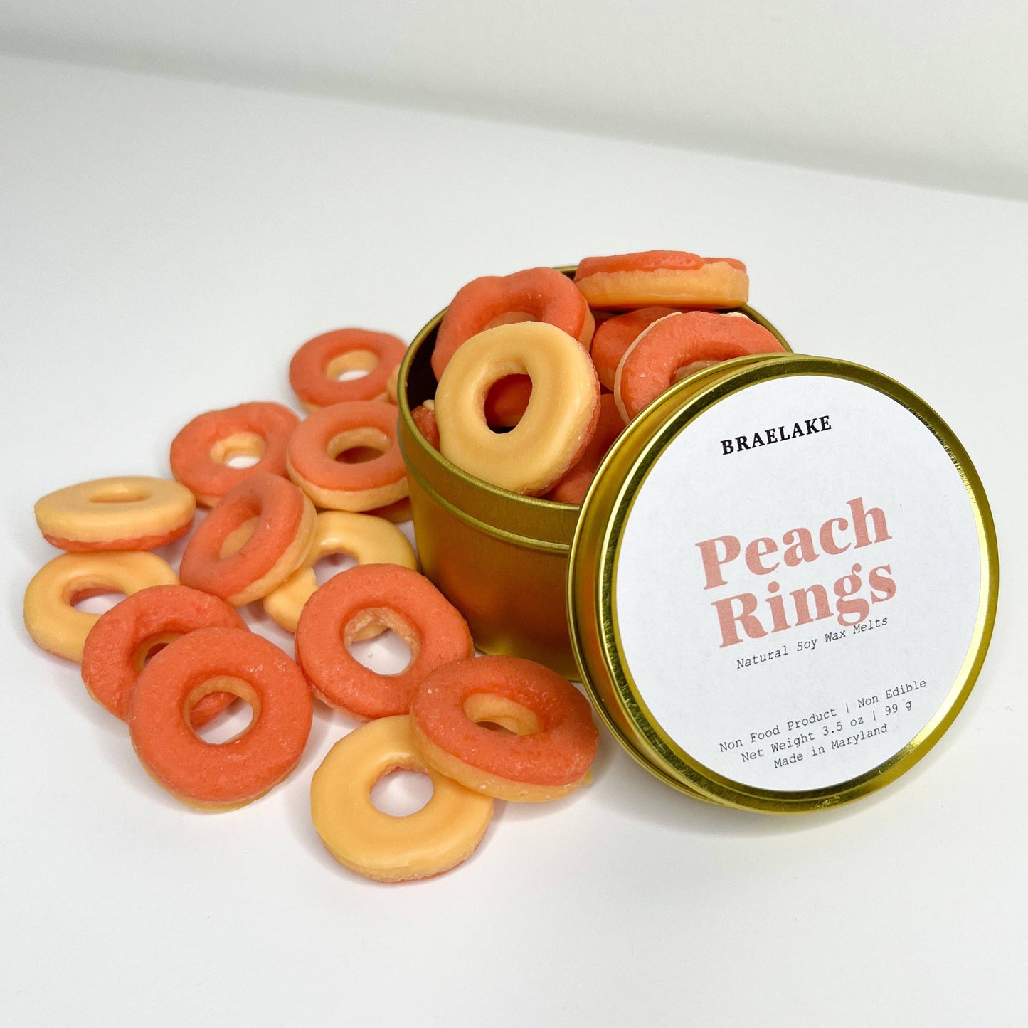 The Peach Rings Wax Melts includes a reusable gold tin and peach ring shaped melts.
