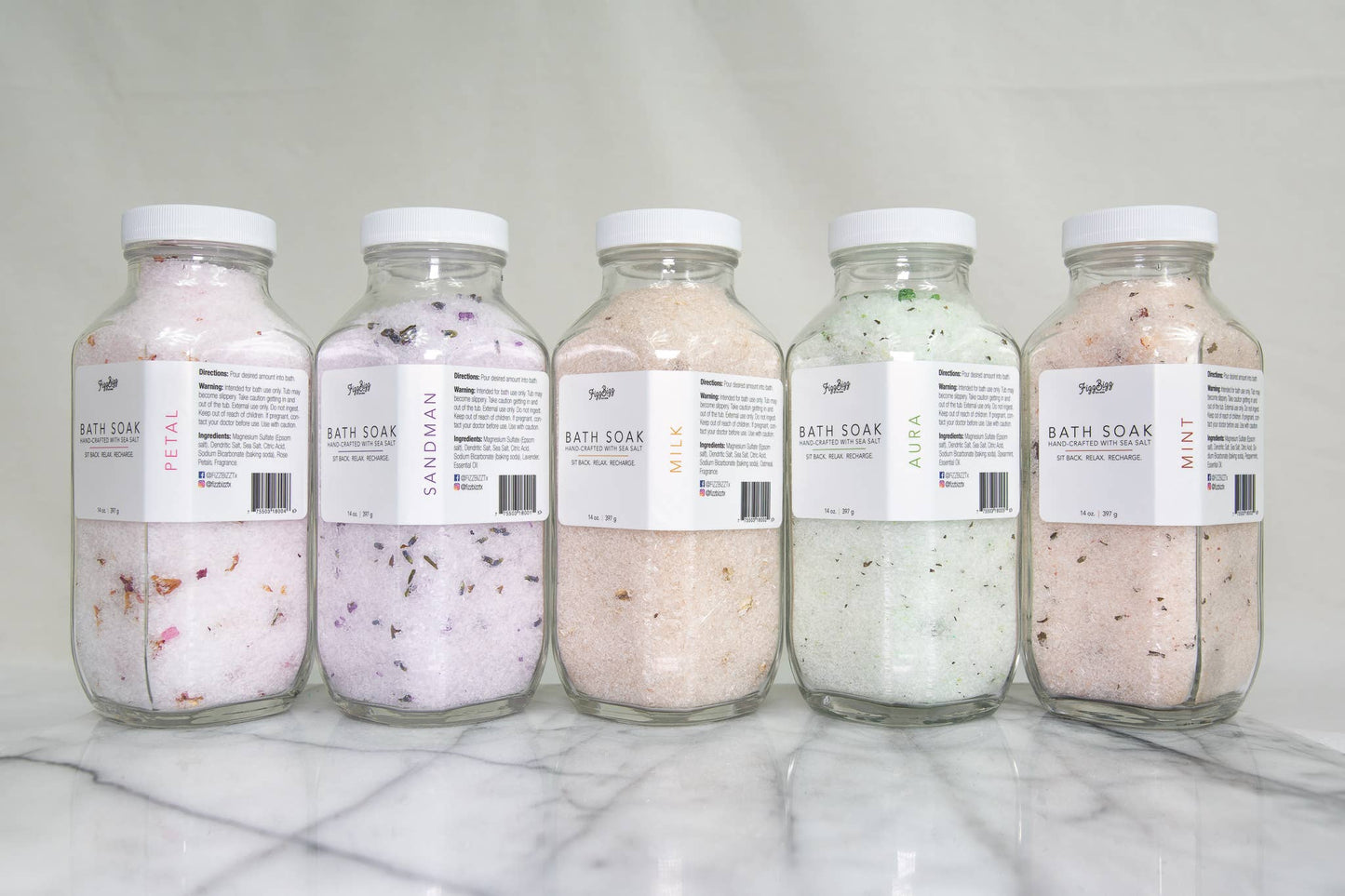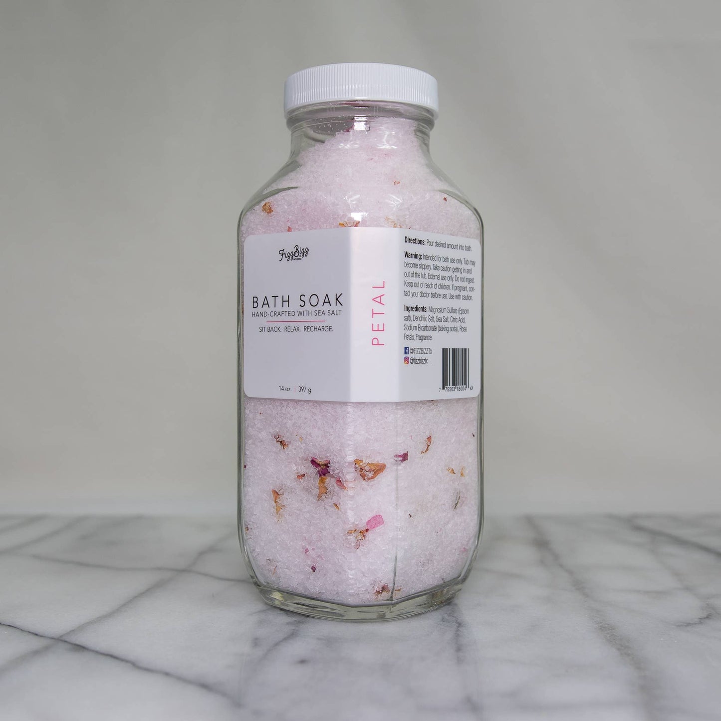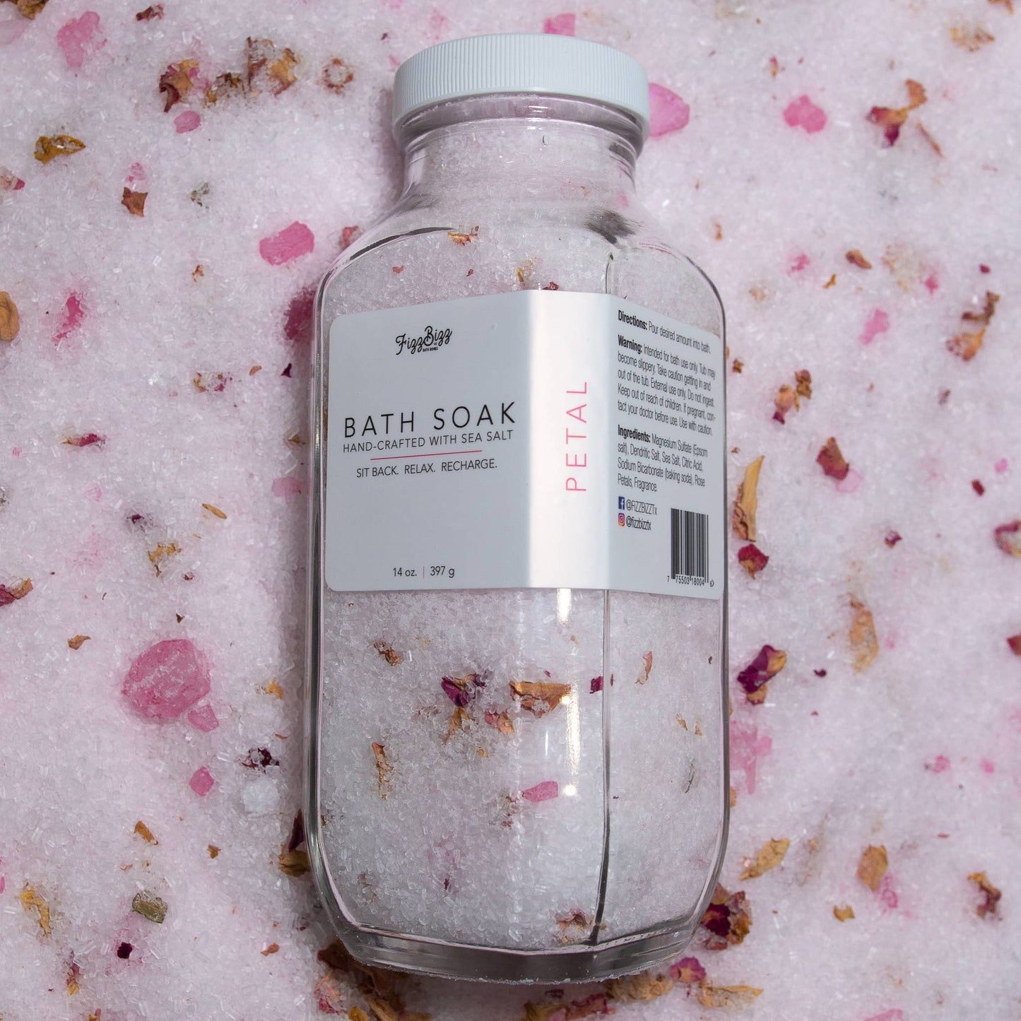 Ingredients: Magnesium Sulfate (Epsom salt), Dendritic Salt, Sea Salt, Citric Acid, Sodium Bicarbonate (Baking Soda), Rose Petals, Essential Oil