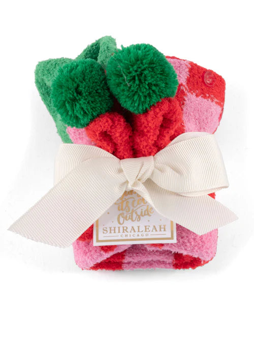 Fuzzy comfort meets polished style in Shiraleah’s Pax Home Socks. These socks feature a fuzzy texture, pompom heel detail, and have a unique feminine flair with its fun all over checkered print in a festive pink, red and green color combination. These socks have a rubber grip bottom and are packaged ribbon wrapped making them the perfect gift option.
