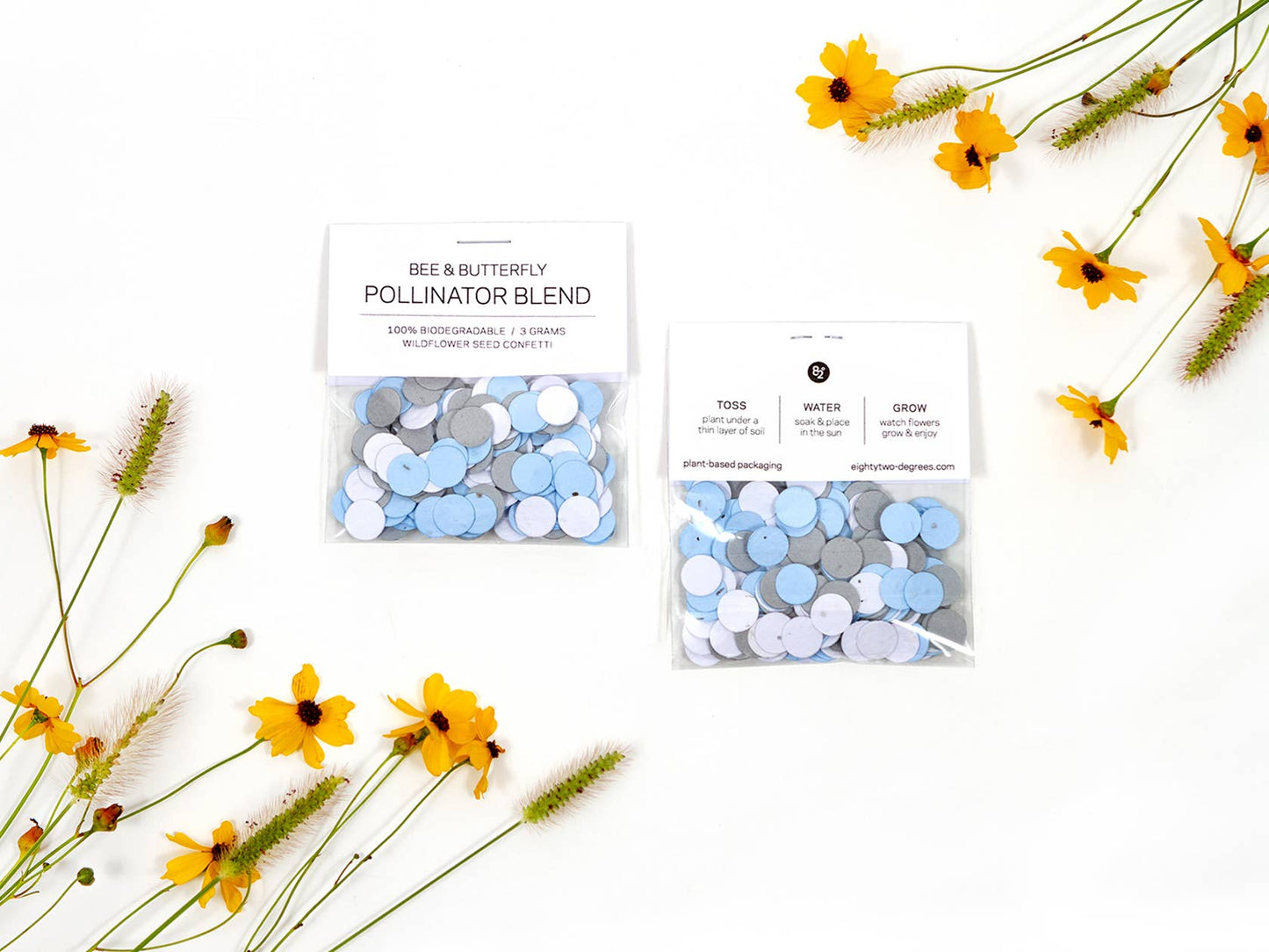 Individually packaged wildflower confetti packs are ready to toss or use to decorate without any environmental concerns. Each confetti color mix is inspired by traditional celebrations throughout the year but could be used for any special event. Confetti is made from biodegradable paper embedded with a mixture of wildflower seeds. Feel good about helping the local ecosystem by planting pollinator plants that help local bees & butterflies. Your purchase is making a positive impact on the environment!