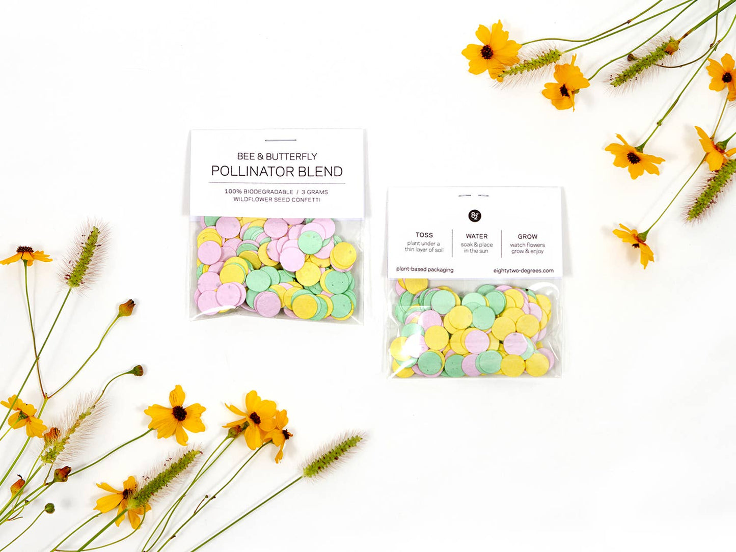 Individually packaged wildflower confetti packs are ready to toss or use to decorate without any environmental concerns. Each confetti color mix is inspired by traditional celebrations throughout the year but could be used for any special event. Confetti is made from biodegradable paper embedded with a mixture of wildflower seeds. Feel good about helping the local ecosystem by planting pollinator plants that help local bees & butterflies. Your purchase is making a positive impact on the environment!