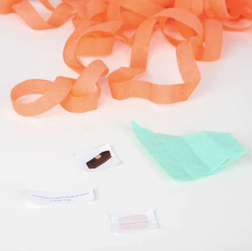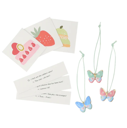 - Each surprise ball contains a green tissue paper hat, 2 stickers with foil, a joke and an enamel butterfly charm on a green cord.