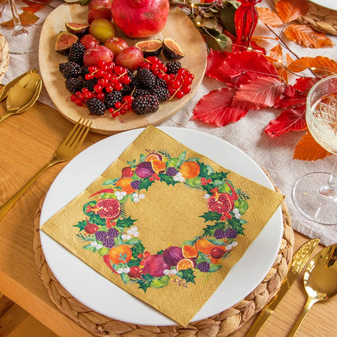 Pack of 20 Gold Napkins with Fruit Wreath by Talking Tables. These large napkins feature an eye-catching Christmas wreath with winter fruits, berries and holly. Ideal for celebrating the Harvest Festival, Thanksgiving or as Christmas napkins for the festive season.