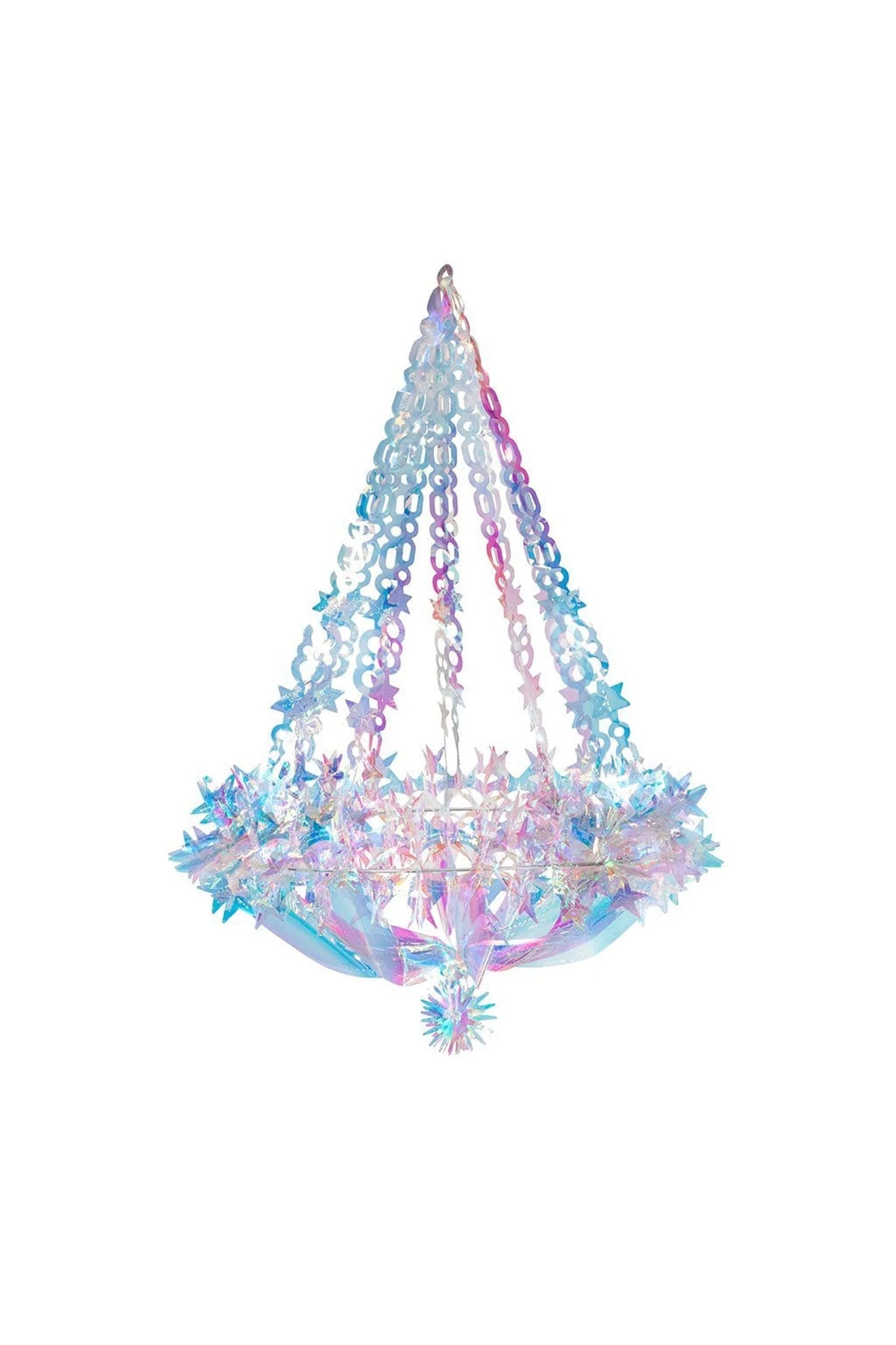 Stage the perfect party with this elegant chandelier made of iridescent material. Measuring 21" in diameter, these chandeliers are easy to assemble, and will for sure be the center piece to any party they're part of. Easily collapsible for storage when not in use.